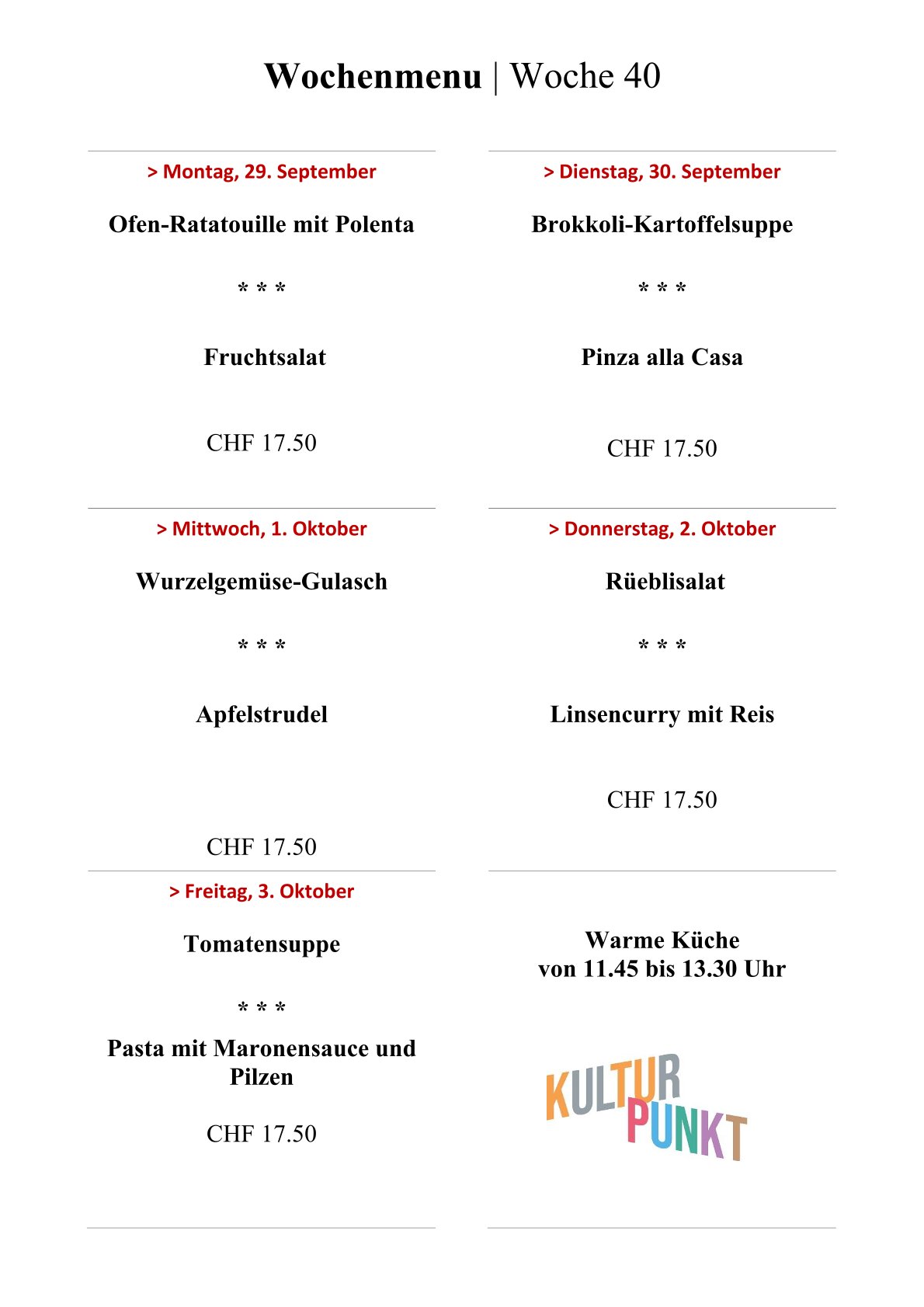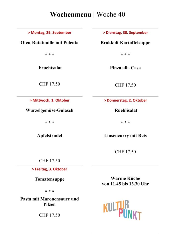 Ein wichtiger Teil des Kulturpunkt ist unsere Gastronomie mit vegetarischer Küche. Wir bieten täglich ein preiswertes, hausgemachtes Tagesmenü an und laden dich herzlich ein, uns über Mittag zu besuchen. Die Vorspeise und der Hauptgang können auch einzel bestellt werden.