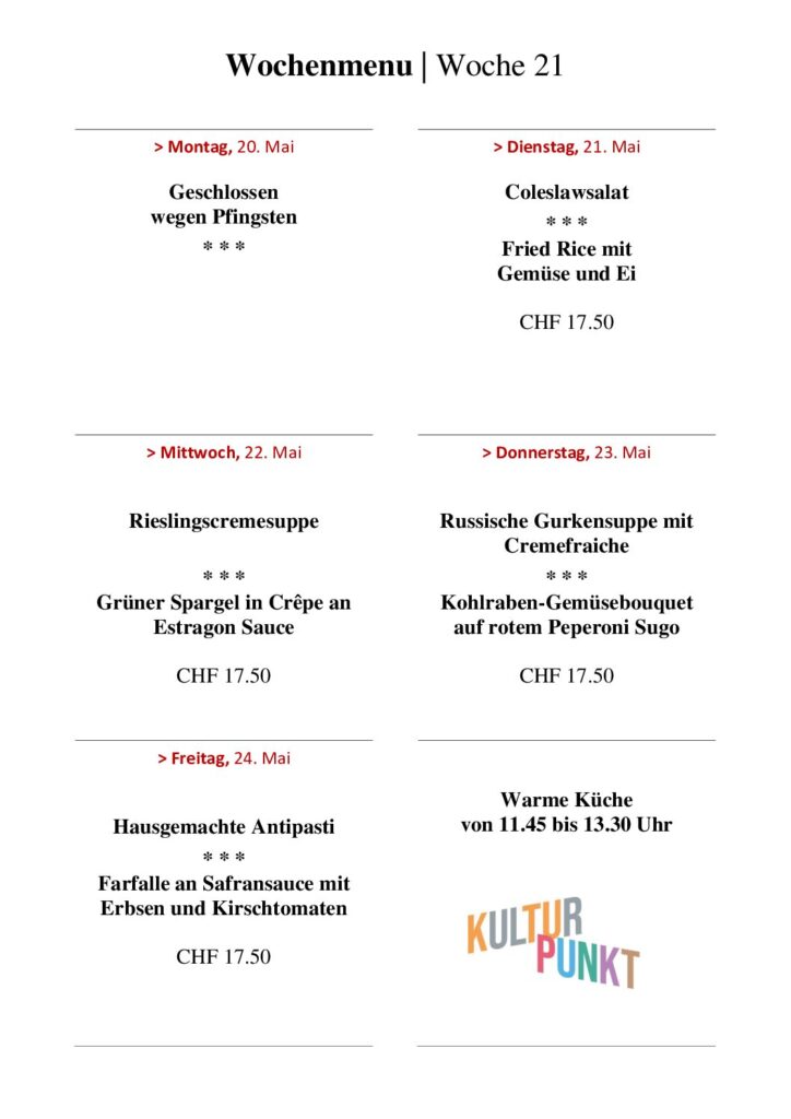 Der KULTURPUNKT bietet täglich ein preiswertes, hausgemachtes Tagesmenü und empfiehlt sich mit seinen frisch zubereiteten Speisen als idealer Begegnungsort über Mittag. Werde auch du Teil der Gemeinschaft am langen Tisch […]