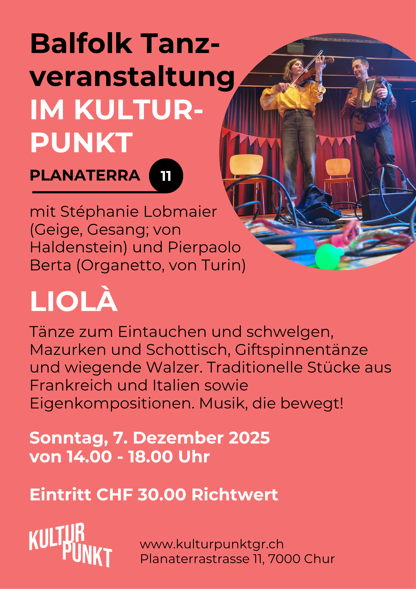 Liolà besteht aus Stéphanie Lobmaier (Geige, Gesang; von Haldenstein) und Pierpaolo Berta (Organetto, von Turin). Wir spielen Balfolk Musik; Tänze zum Eintauchen und schwelgen, Mazurken und Schottisch, Giftspinnentänze und wiegende Walzer. Traditionelle Stücke aus Frankreich und Italien sowie Eigenkompositionen. Musik, die bewegt!