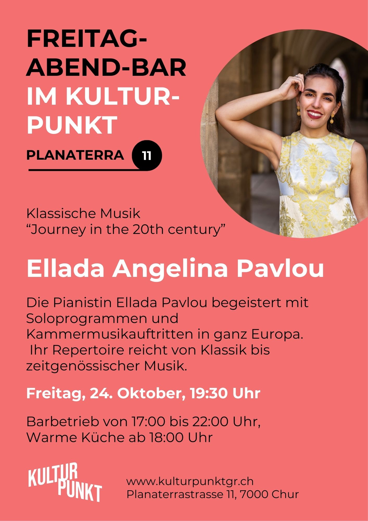 Die griechische Pianistin Ellada Pavlou studierte in London und Manchester und arbeitete mit namhaften Pianisten wie Demidenko und Roge. Sie konzertiert europaweit, u. a. in Wien, Athen, Rom und Paris, sowohl solistisch als auch in Kammermusikensembles wie dem Duo Elva. Ihr Interesse an zeitgenössischer Musik führte zu Uraufführungen in Wien und internationalen Kooperationen mit Komponisten. Zu ihren jüngsten Projekten zählen Auftritte mit Sopran und Cello, eine CD-Produktion sowie geplante Konzerte in Spanien, Griechenland, Italien und Österreich.