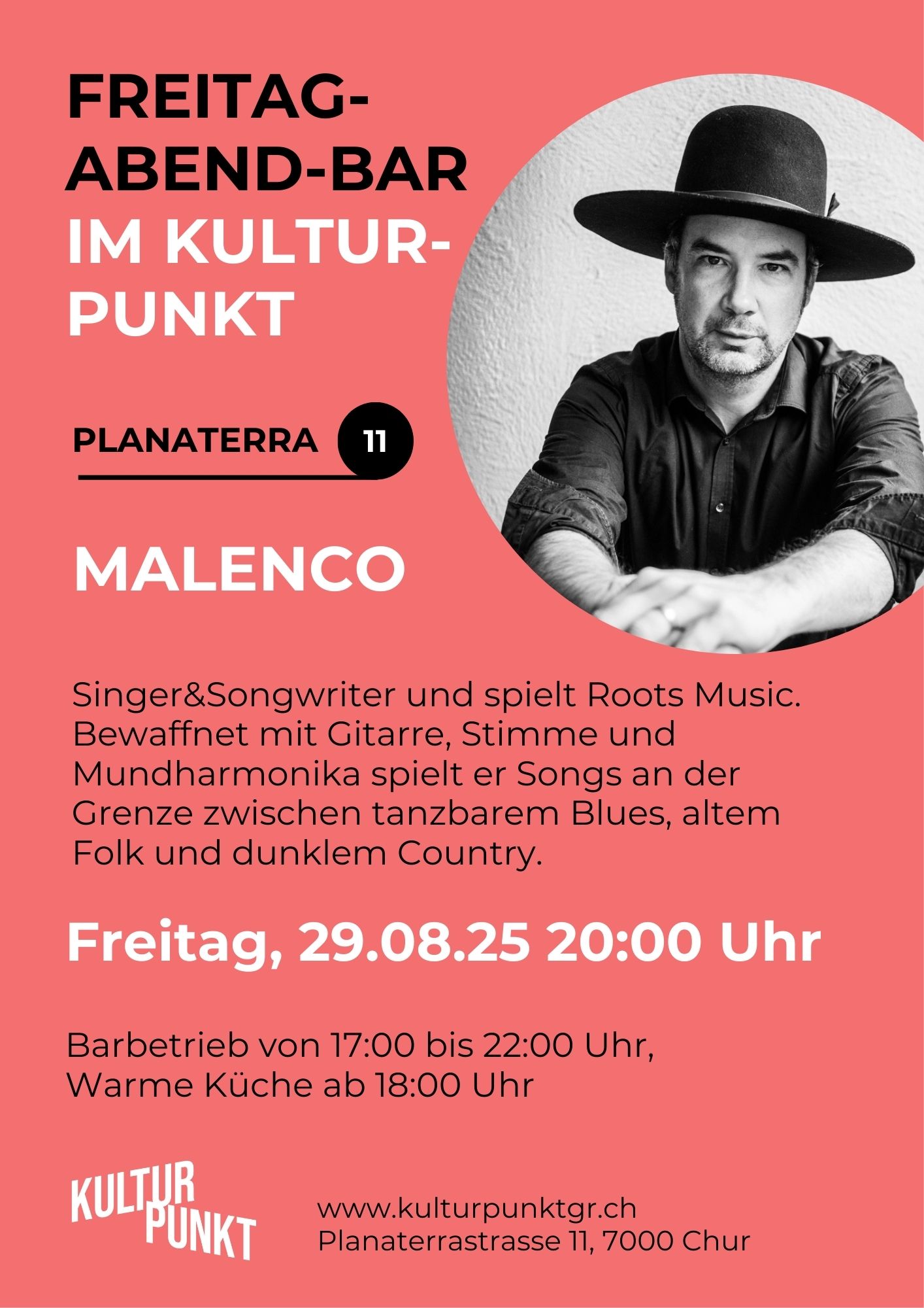 Heute zu Gast ist MALENCO – Singer & Songwriter, der mit Gitarre, Stimme und Mundharmonika seine ganz eigene Mischung aus Roots Music präsentiert. Seine Songs bewegen sich an der Grenze zwischen tanzbarem Blues, traditionellem Folk und dunklem Country. Authentisch, roh und mitreissend – Musik, die direkt ins Herz geht und die Beine nicht stillstehen lässt.