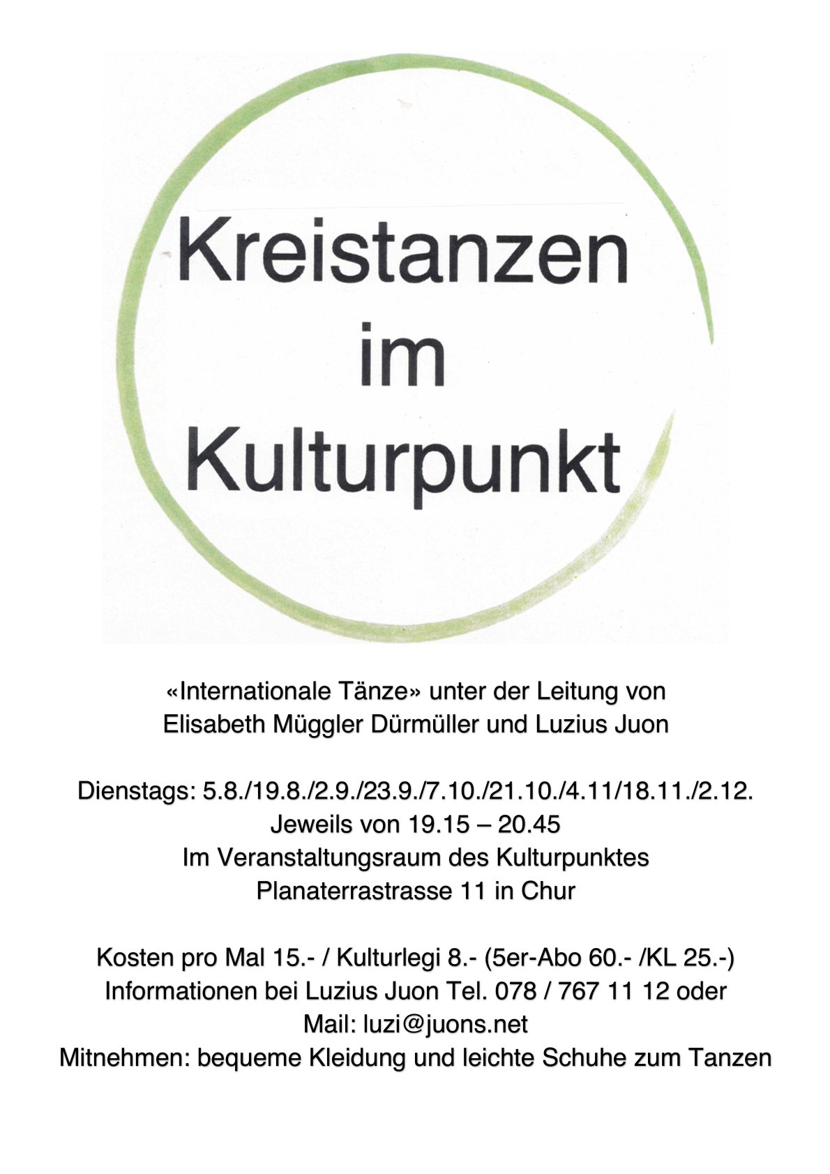 "Internationale Tänze" unter der Leitung von Elisabeth Müggler Dürmüller und Luzius Juan. Kosten pro Mal 15,- / Kulturlegi 8,- Mitnehmen: bequeme Kleidung und leichte Schuhe zum Tanzen Hintergrund: Traditionelles Kreistanzen ist eine uralte Form des Gemeinschaftstanzes, die in vielen Kulturen weltweit praktiziert wird. Diese Tänze werden oft in einem Kreis ausgeführt, was die Verbundenheit und […]