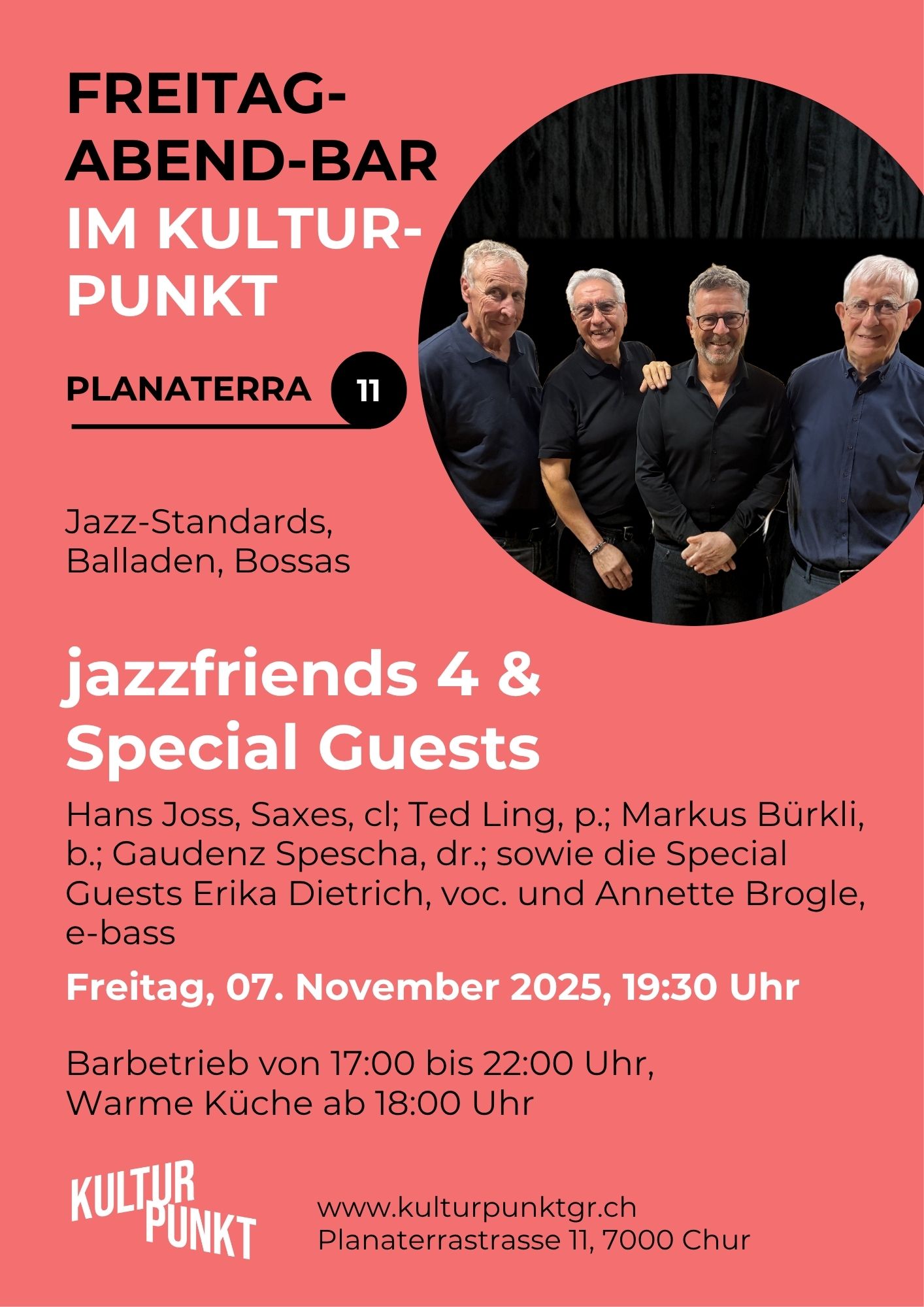 Letzte FREITAG-ABEND-BAR im 2025   Am Freitag, 7. November 2025 um 19:30 Uhr findet die letzte FREITAG-ABEND-BAR dieses Jahres IM KULTURPUNKT statt. Die jazzfriends 4 & Special Guests präsentieren […]
