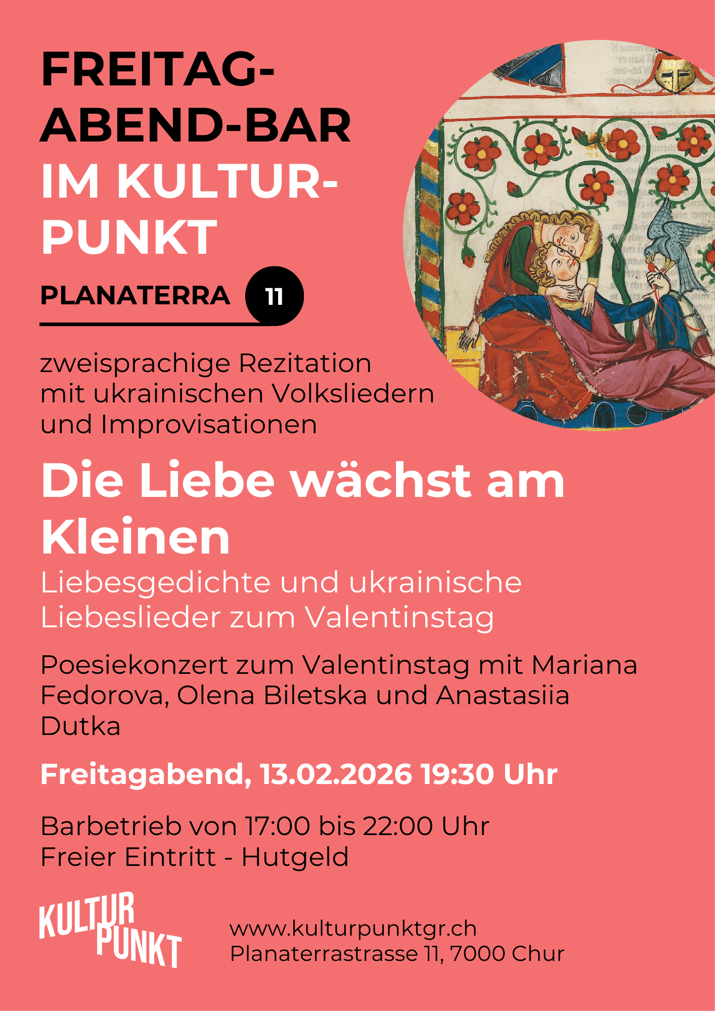 "Die Liebe wächst am Kleinen" – Liebesgedichte und ukrainische Liebeslieder zum Valentinstag Zur deutschen und ukrainischen Rezitation von Mariana Fedorovas Liebesgedichten ertönen alte ukrainische Liebeslieder und Improvisationen. Sie tragen die Zuhörer in eine Welt, in der Wort und Musik zur Stimme des Herzens werden. Die Liebe ist die Kraft, die keine Grenzen und keine Zeit […] |