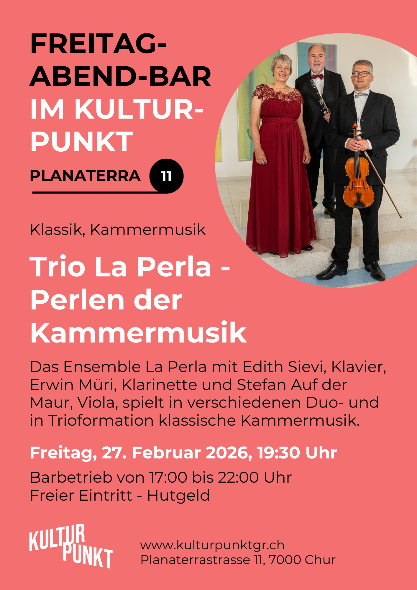 Trio La Perla Das Trio La Perla wurde vor 5 Jahren von den drei Berufsmusikern Erwin Müri, Klarinette, Stefan Auf der Maur, Viola, und Edith Sievi, Klavier, gegründet. Erwin Müri kommt aus Zürich und spielt in verschiedenen Ensembles. Stefan Auf der Maur unterrichtet an mehreren Musikschulen und spielt ebenso in verschiedenen Ensembles. Edith Sievi arbeitet […] |