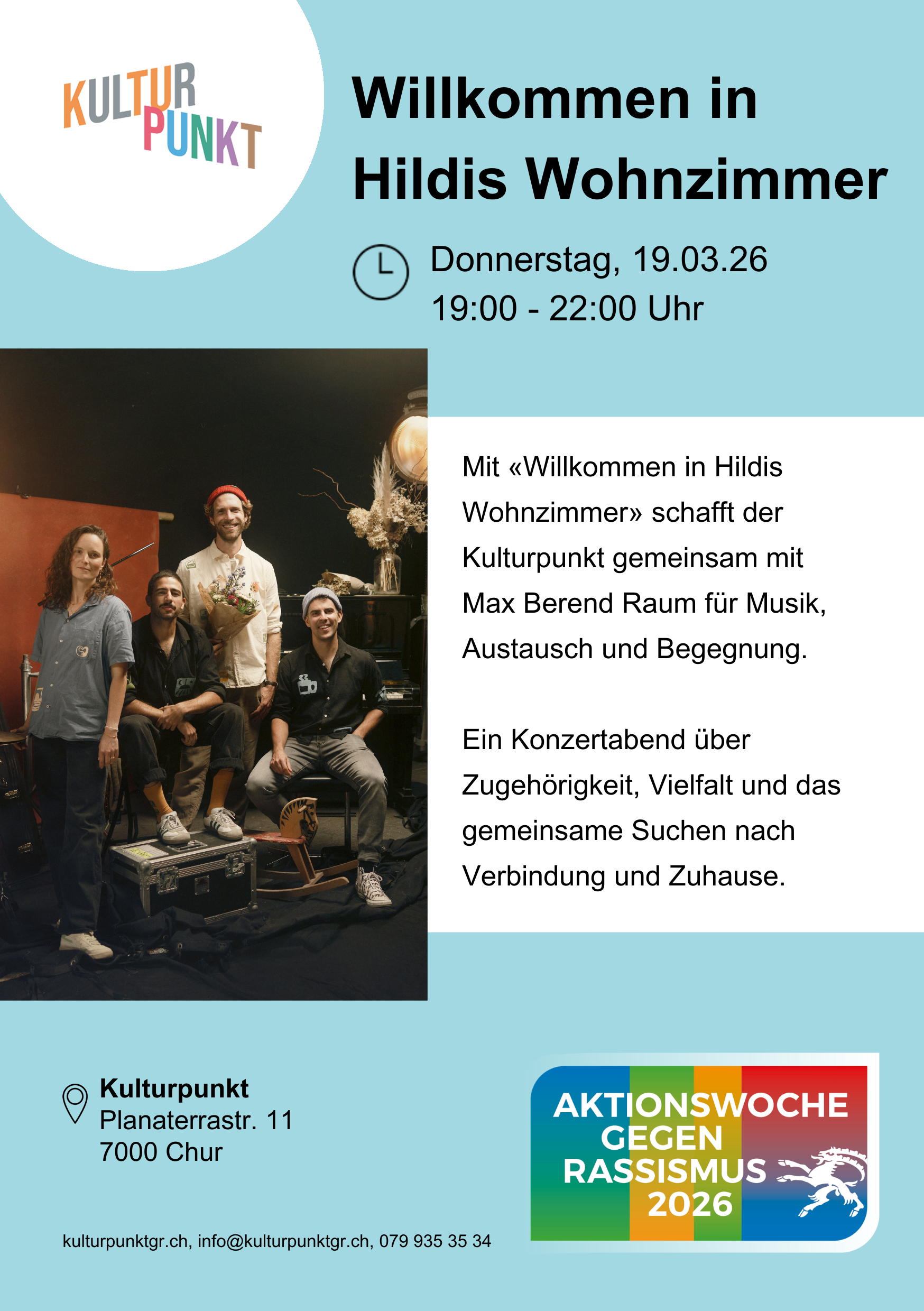 Mit «Willkommen in Hildis Wohnzimmer» schaffen der Kulturpunkt und Max Berend einen besonderen Raum für Musik, Austausch und echte Begegnung. Der Konzertabend lädt dazu ein, gemeinsam über Zugehörigkeit, Vielfalt und das Gefühl von Zuhause nachzudenken. Zwischen Klängen und Gesprächen entsteht ein Ort der Verbindung – offen, nahbar und voller lebendiger Momente. Dieses Konzert ist Teil […]
