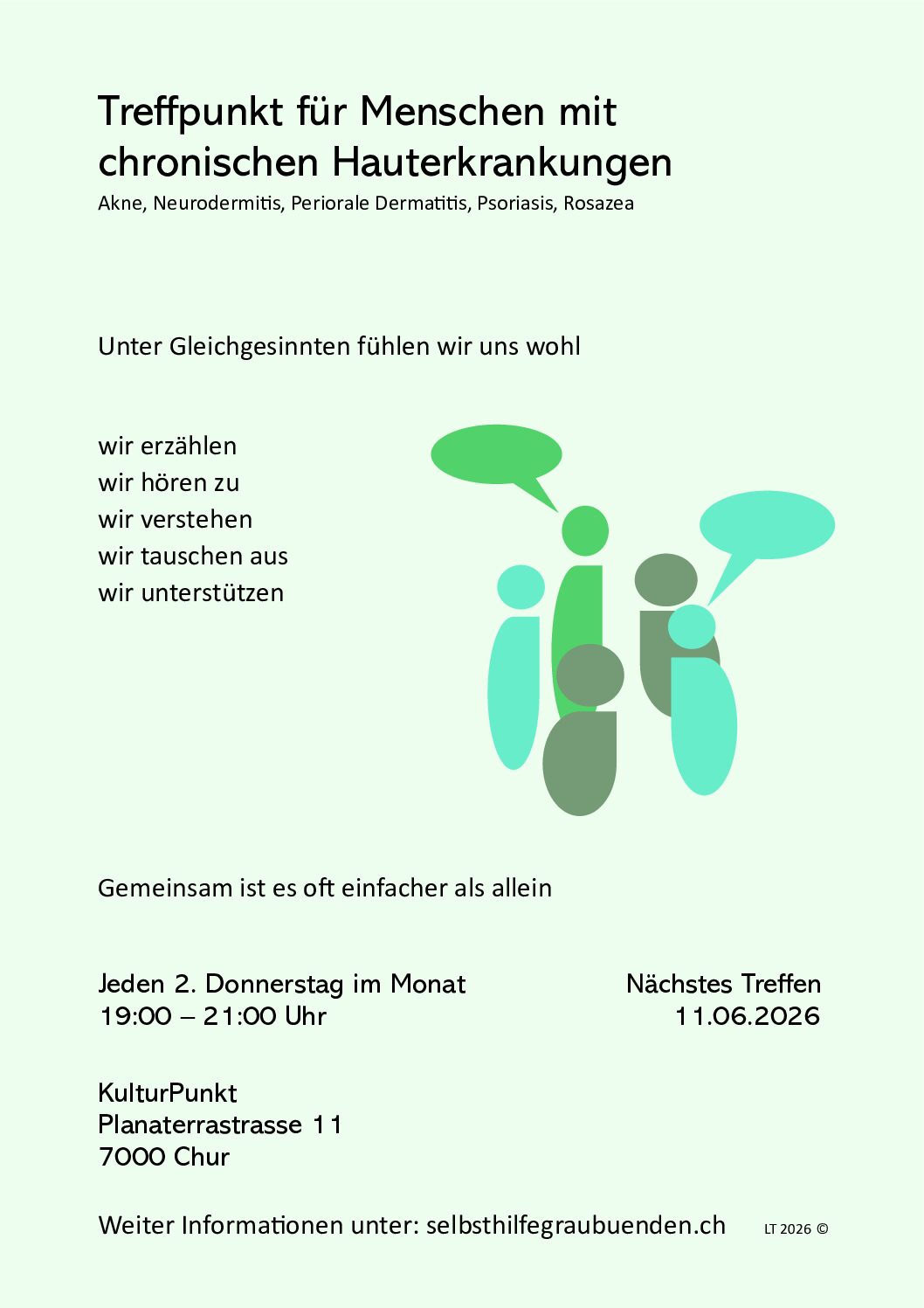 Der Treffpunkt richtet sich an Menschen mit chronischen Hauterkrankungen wie Akne, Neurodermitis, Periorale Dermatitis, Psoriasis oder Rosazea. In einer offenen und wertschätzenden Atmosphäre entsteht ein Raum, in dem sich Betroffene begegnen, austauschen und gegenseitig unterstützen können.