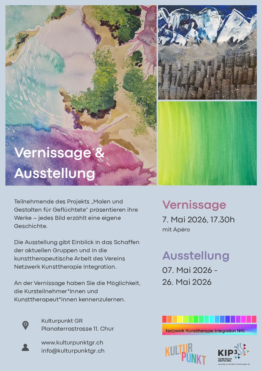 Die Ausstellung zeigt das aktuelle Schaffen der Gruppen sowie die kunsttherapeutische Arbeit des Vereins Netzwerk Kunsttherapie Integration. Sie macht sichtbar, wie kreatives Gestalten Begegnung ermöglicht, Ressourcen stärkt und Integration fördern kann.